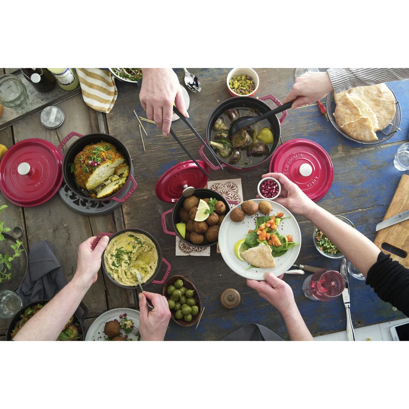 Traag gegaarde gerechten zijn helemaal in en jonge koks willen deze kunst net zo graag beheersen als ervaren chefs. De unieke smaken van ‘slow-cooked’ vlees en groenten ontwikkelen zich optimaal in een braadpan, zoals deze ronde kersenrode cocotte van Staub. Hij heeft niet alleen een mooi, eenvoudig design, maar bestaat ook uitzonderlijke materialen. Met haar diameter van 22 cm is deze braadpan de ideale keukenpartner voor kleine gezinnen of singles. De cocotte heeft een inhoud van 2,6 l en is perfect om een kleinere hoeveelheid groenten, vis of vlees te bereiden. Aan de binnenzijde is de cocotte afgewerkt met matzwart email om het voedsel perfect dicht te schroeien en de natuurlijke smaken in de ingrediënten te verzegelen. De eigenschappen van het materiaal worden alleen maar beter naarmate u de pot vaker gebruikt. Natuurlijk is de Staub cocotte geschikt voor alle kookoppervlakken. Dankzij de combinatie van gietijzer en email wordt de warmte perfect verspreid in de cocotte. Gietijzer is snel en gemakkelijk te reinigen en tegelijk uiterst slijtvast. Ontdek zelf hoe praktisch de Staub cocotte is en creëer moeiteloos hemelse stoofschotels in uw eigen keuken.